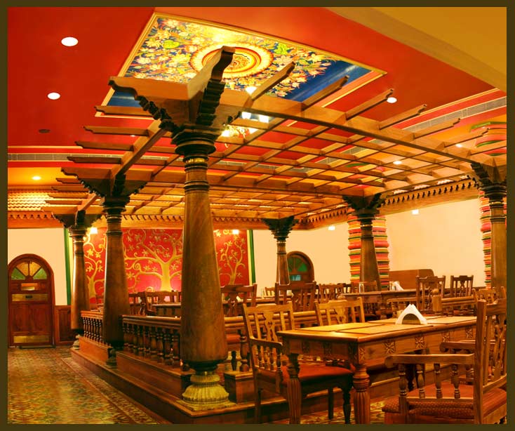 We spotted an interestingly done up Chic King. Apparently they started off in Cochin. We were too tired to walk any further and we were keen on grabbing a bite and getting home banana chips. Stopped by a bakery and bought chips. While at the bakery I had one amazing idea that flashed by! Why not kill time by getting ourselves a good foot massage. We deserved it as we were dead tired. We googled for it and the list that came up made us laugh like hell. There was Erotic Massage Parlour, Gay Pleasure Parlour and so on! Hell No! Foot Massage went off our list of POA. We just decided to find a Coffee Day and sit in the AC. Did that. Finally walked to Woodlands for dinner. It was not the same group. I knew it because I know the logo and I know the family. However, it was still Mangalorean. They had a restaurant called Rangoli inside. We loved the ambience. Old pillars, traditional look and colourful. I really loved the look and feel. The food was mediocre.