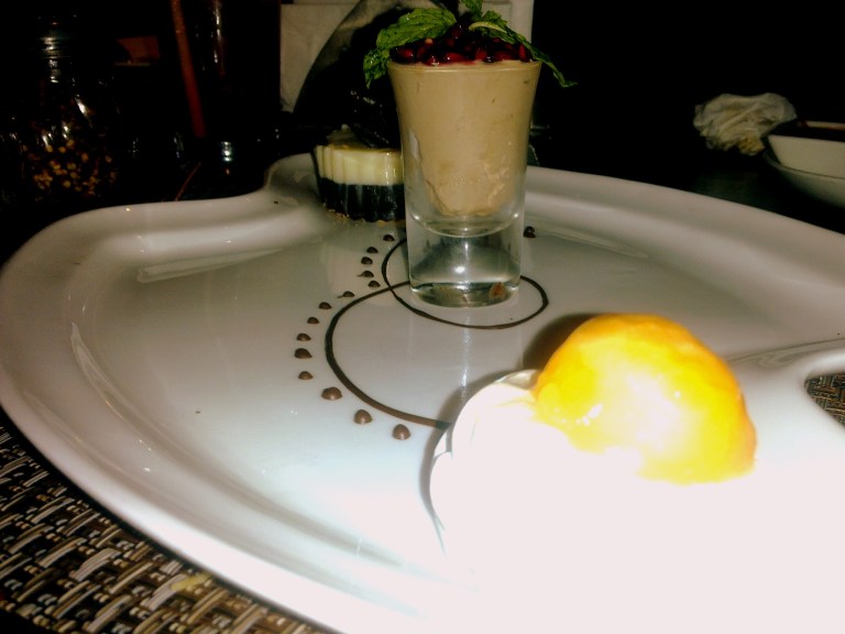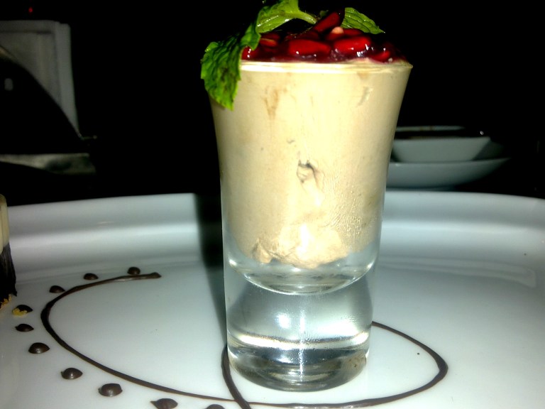 My Ganache arrived. I flipped over. Seriously. The presentation had won the battle for me. I really didn’t care if it was even horrible. The plate had 3 elements – a round tart, a shot glass filled with coffee cream topped with pomegranates and another tiny round chocolate coin topped with whipped cream a bulb of muskmelon coated with sugar syrup. First had the muskmelon and whipped cream. Orgasm. Next, the coffee cream. Double Orgasm. The pomegranate added a strange kick to it. The tart by itself was average. I did not pretty much like the white chocolate part. It was good though.